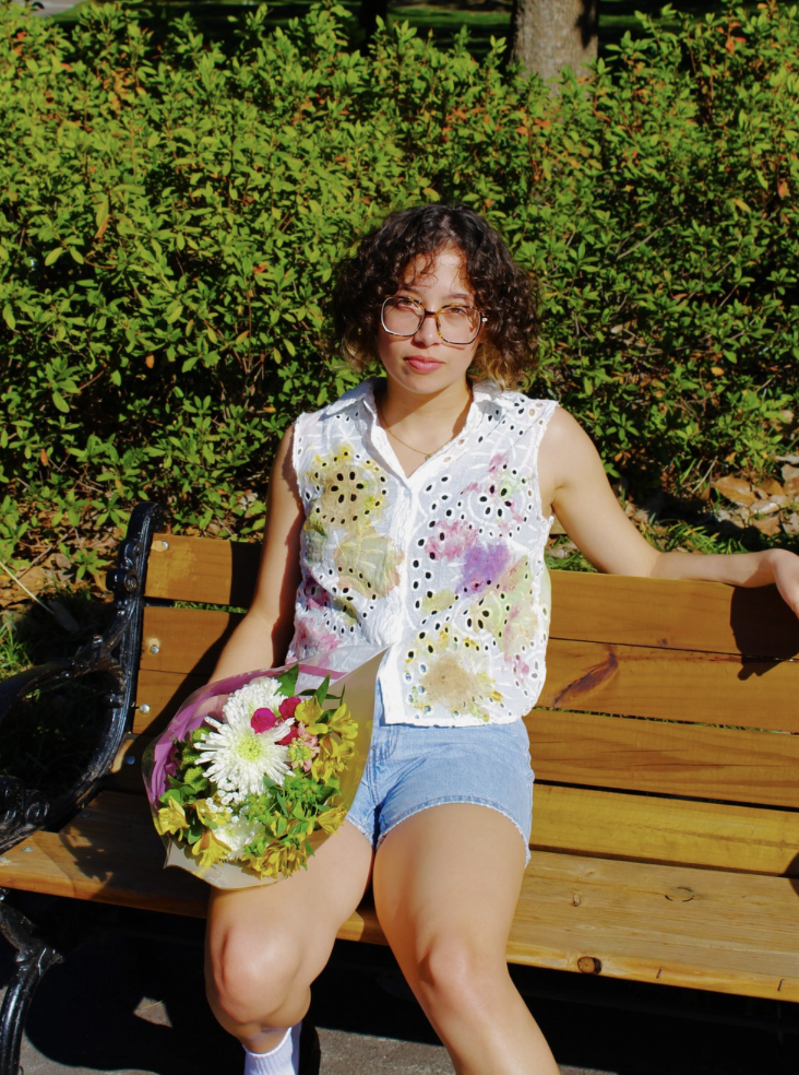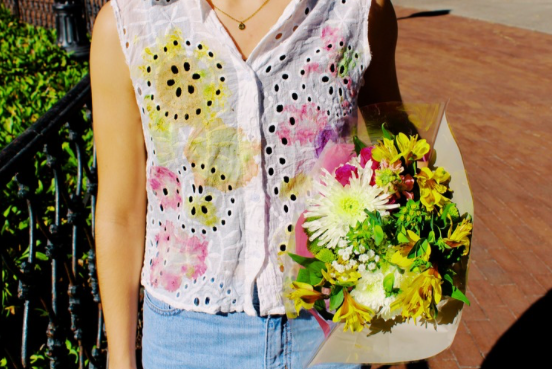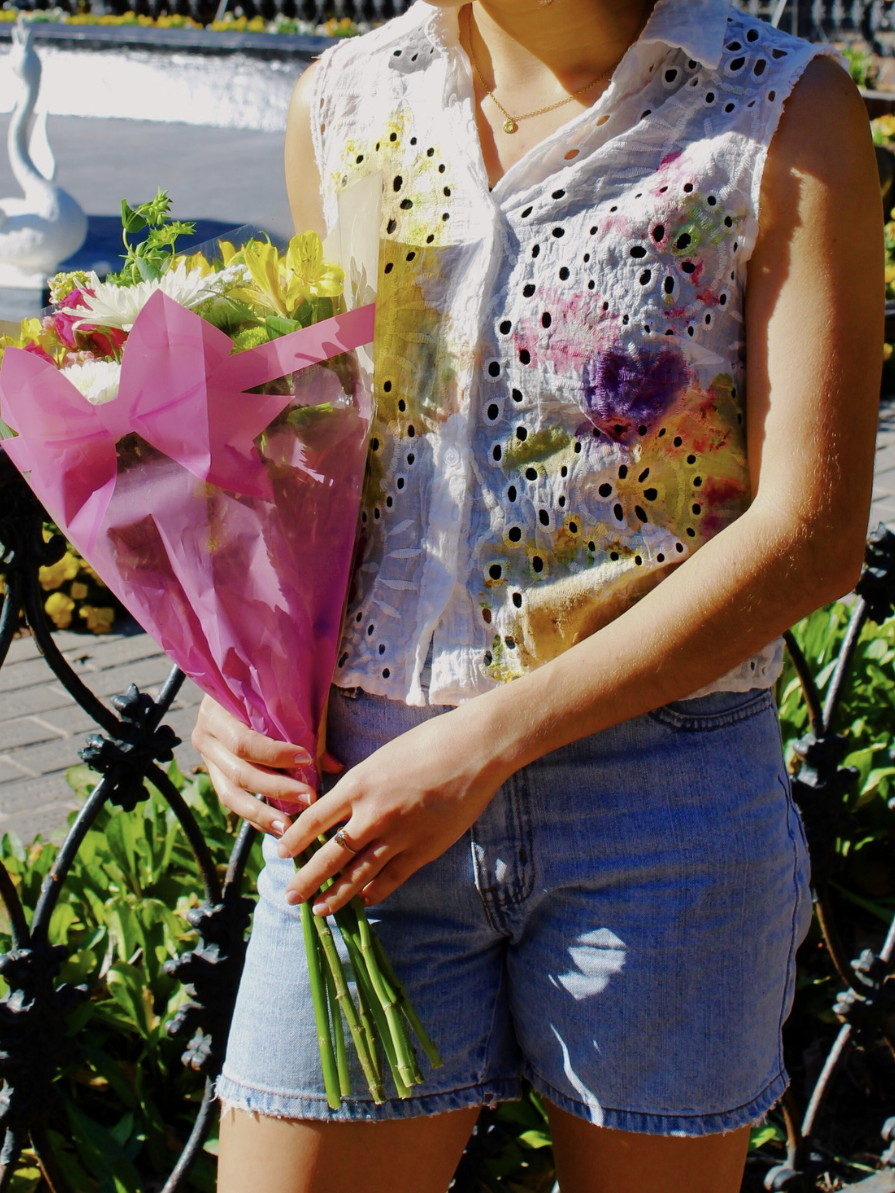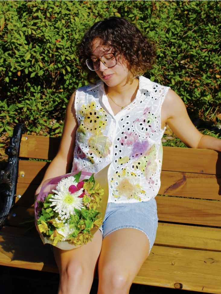 a natural dyed recycled garment developed with flower pounding. back to the fun! talent: fiona covington